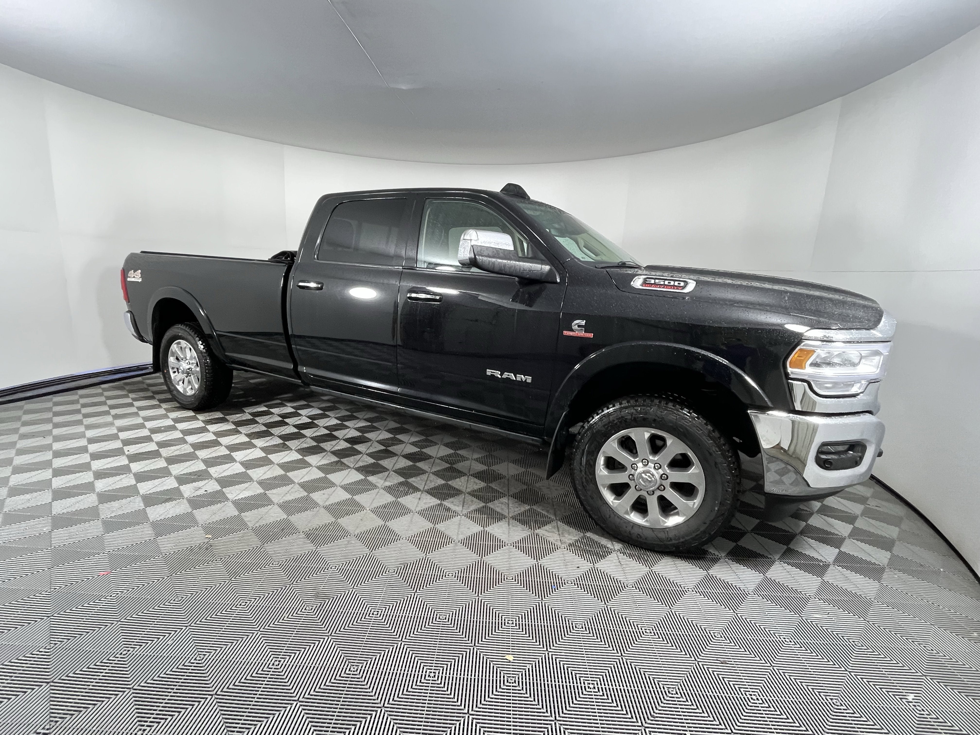 Diamond Black Crystal Pearlcoat 4WD 6.7L I6 Aisin 6-Speed Automatic #1 Seat Foam Cushion, 1-Year SiriusXM Guardian Trial, 10 Speakers, 115V Auxiliary Rear Power Outlet, 12 Touchscreen Display, 17 Speaker harman kardon Premium Sound, 2 Way Rear Headrest Seat, 20 Polished Aluminum Wheels, 220 Amp Alternator, 2nd Row In Floor Storage Bins, 3.73 Axle Ratio, 4 Way Front Headrests, 4-Wheel Disc Brakes, 5-Year SiriusXM Traffic Service, 5-Year SiriusXM Travel Link Service, 5th Wheel/Gooseneck Towing Prep Group, 8.4 Touchscreen Display, ABS brakes, Active Noise Control System, Adaptive Cruise Control w/Stop, Adaptive Steering System, Adjustable pedals, Air Conditioning, Alloy wheels, AM/FM radio: SiriusXM, Apple CarPlay, Apple CarPlay/Android Auto, Auto High Beam Headlamp Control, Auto-dimming Rear-View mirror, Automatic temperature control, Blind Spot & Cross Path Detection, Brake assist, Bumpers: chrome, Center Hub, Compass, CTR Stop Lamp w/Cargo View Camera, Delay-off headlights, Disassociated Touchscreen Display, Driver door bin, Driver vanity mirror, Dual front impact airbags, Dual front side impact airbags, Electronic Stability Control, Electronically Controlled Throttle, Exterior Mirrors w/Memory, Foam Bottle Insert (Door Trim Panel), Folding Flat Load Floor Storage, For Details Visit DriveUconnect.com, Front & Rear Rubber Floor Mats, Front anti-roll bar, Front Bumper Sight Shields, Front Center Armrest w/Storage, Front dual zone A/C, Front fog lights, Front reading lights, Front Seat Back Map Pockets, Full Speed Forward Collision Warning Plus, Fully automatic headlights, Garage door transmitter, Google Android Auto, GPS Antenna Input, GPS Navigation, HD Radio, Heated door mirrors, Heated Front Seats, Heated front seats, Heated Second Row Seats, Heated Steering Wheel, Heated steering wheel, High Back Seats, Illuminated entry, Integrated Center Stack Radio, Integrated Voice Command w/Bluetooth®, Lane Keep Assist, Laramie Level 2 Equipment Group, Leather steering wheel, Leather Trim 40/20/40 Bench Seat, LED Bed Lighting, Low tire pressure warning, Media Hub w/2 Charge Only USBs, Mirror-Mounted Aux Reverse Lamps, Occupant sensing airbag, Outside temperature display, Overhead airbag, Overhead console, Panic alarm, ParkView Rear Back-Up Camera, Passenger door bin, Passenger vanity mirror, Power 8-Way Adjustable Passenger Seat, Power Adjust 8-Way Driver Seat, Power Adjustable Convex Aux Mirrors, Power Adjustable Pedals w/Memory, Power Chrome Tow Mirrors w/Convex Spotter & Memory, Power Deployable Running Boards, Power door mirrors, Power driver seat, Power passenger seat, Power steering, Power Sunroof, Power windows, Quick Order Package 21H Laramie, Radio data system, Radio: Uconnect 12.0 w/Navigation, Radio: Uconnect 4 w/8.4 Display, Radio: Uconnect 4C Nav w/8.4 Display, Radio/Driver Seat/Mirrors/Pedals Memory, Rain Sensitive Windshield Wipers, Rear 60/40 Folding Seat, Rear reading lights, Rear seat center armrest, Rear step bumper, Rear Wheelhouse Liners, Rear window defroster, Remote keyless entry, Remote Tailgate Release, Safety Group, Security system, SiriusXM Satellite Radio, SiriusXM Traffic Plus, SiriusXM Travel Link, SiriusXM w/360L, Speed control, Split folding rear seat, Spray In Bedliner, Steering wheel mounted audio controls, Surround View Camera System, Tachometer, Tilt steering wheel, Tip Start, Towing Technology Group, Traction control, Trailer Reverse Guidance, Trip computer, Turn signal indicator mirrors, USB Host Flip, Variably intermittent wipers, Ventilated Front Seats, Voltmeter, Wheels: 18 x 8.0 Polished Aluminum, Ask now about our incredible inventory sell down sale, With over 60 lenders to work with, we can get you the best financing with flexible terms available.You even get it with our 3 month/4,000 mile Royal Shield used car warranty! You also get free 24-hour roadside assistance, a free Carfax history report, a free comprehensive 50-point vehicle inspection with shop checklist, rental car